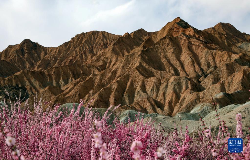 4月8日拍攝的青海貴德國家地質(zhì)公園丹霞地貌與盛開(kāi)的春花。