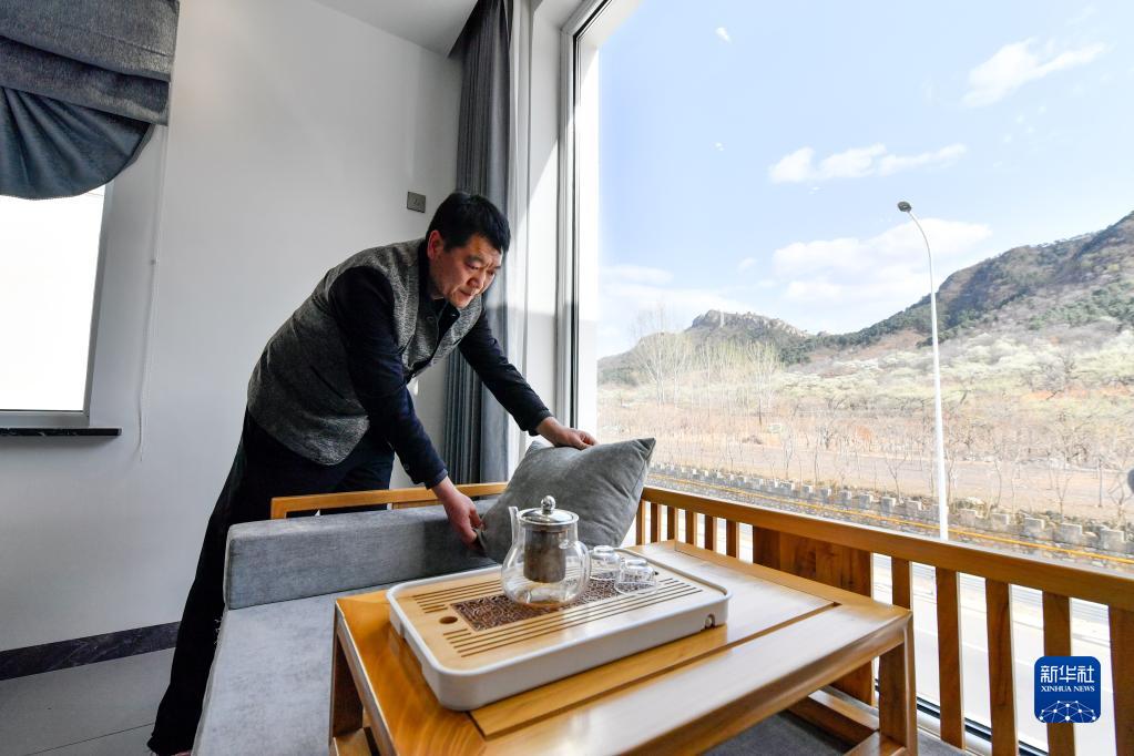 4月6日,在天津市薊州區下?tīng)I鎮團山子村,民宿經(jīng)營(yíng)者收拾房間準備迎客。