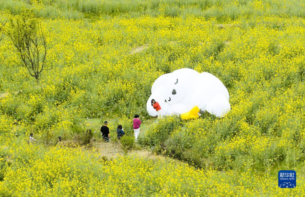 游客在浙江省紹興市上虞區覆卮山古梯田間留影(4月3日攝)。