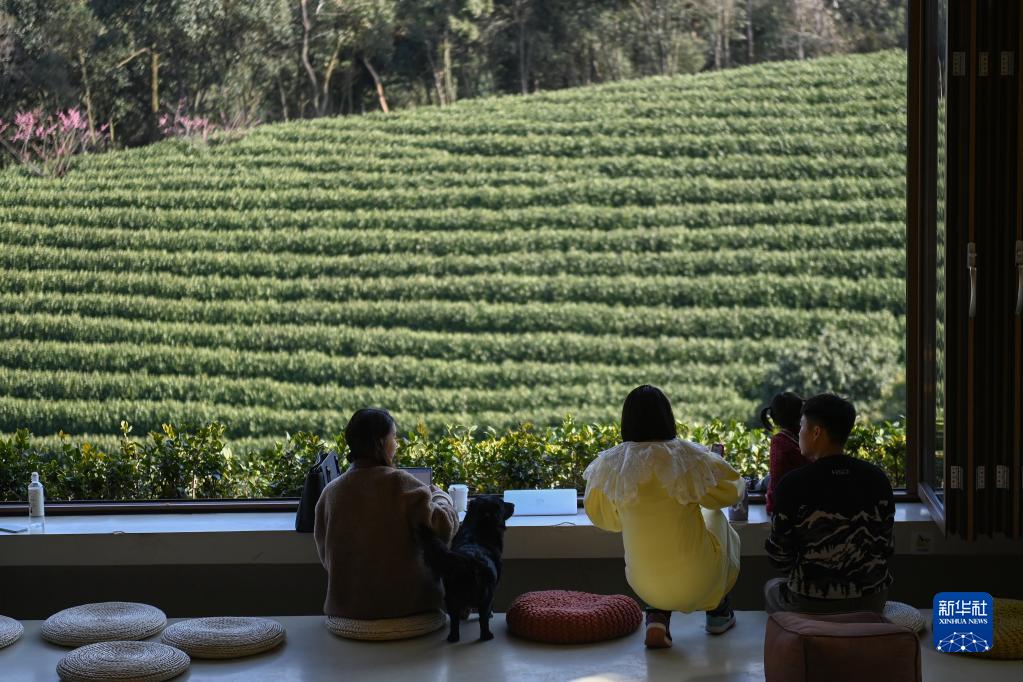 游客在浙江省安吉縣黃杜村萬(wàn)畝茶園邊的咖啡館休閑(2023年2月21日攝)。