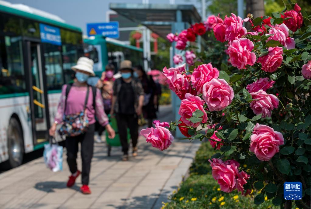 這是4月9日拍攝的昆明市廣福路一處公交站臺旁的月季花。