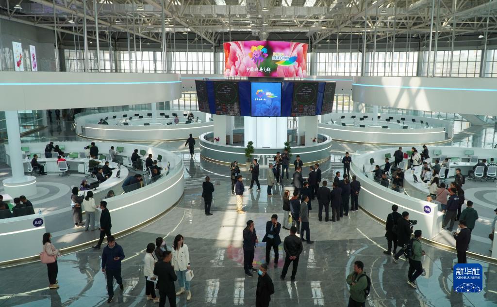 4月9日,人們在昆明國際花卉拍賣(mài)交易中心菏澤分中心交易大廳內參觀(guān)。