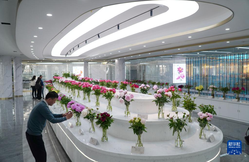 4月9日,人們在昆明國際花卉拍賣(mài)交易中心菏澤分中心的花卉樣品展示區內參觀(guān)。
