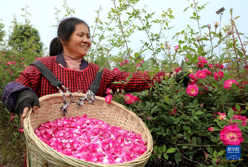 4月9日,在四川省眉山市仁壽縣藕塘鎮,村民在采收玫瑰花。