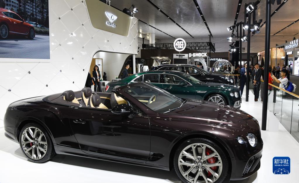 4月10日,觀(guān)眾在第三屆消博會(huì )現場(chǎng)參觀(guān)展出的賓利汽車(chē)。