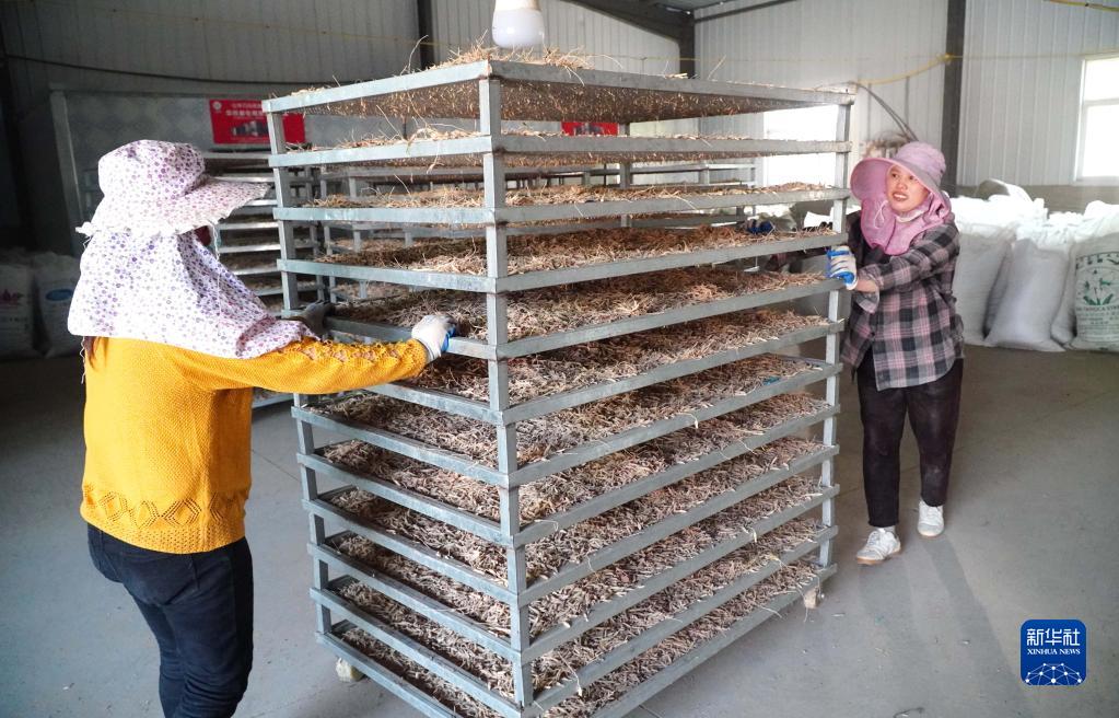 4月10日,在山東省單縣高老家鄉,村民對收獲的麥冬進(jìn)行干燥處理。