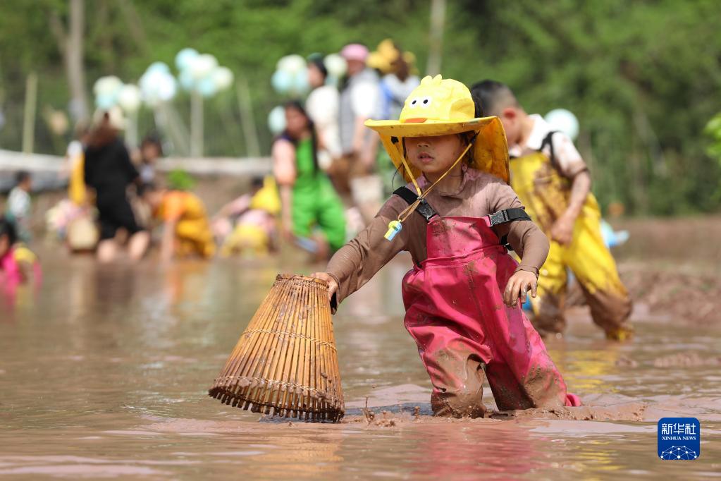 4月10日,四川省廣安市武勝縣東方紅幼兒園的小朋友在龍女鎮的稻田里抓魚(yú)。