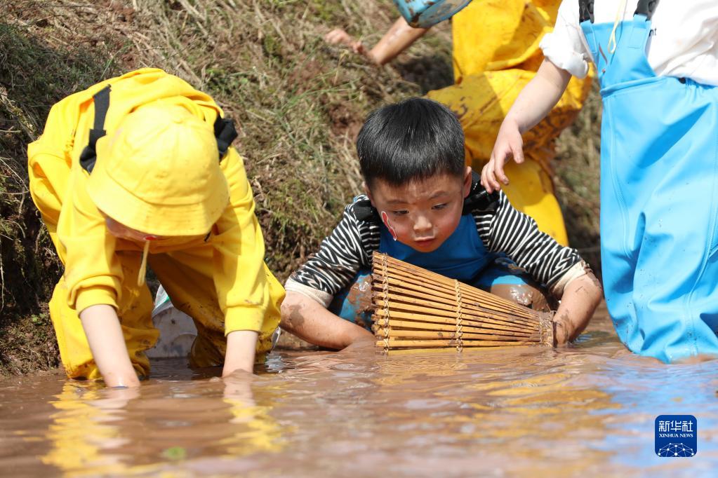 4月10日,四川省廣安市武勝縣東方紅幼兒園的小朋友在龍女鎮的稻田里抓魚(yú)。