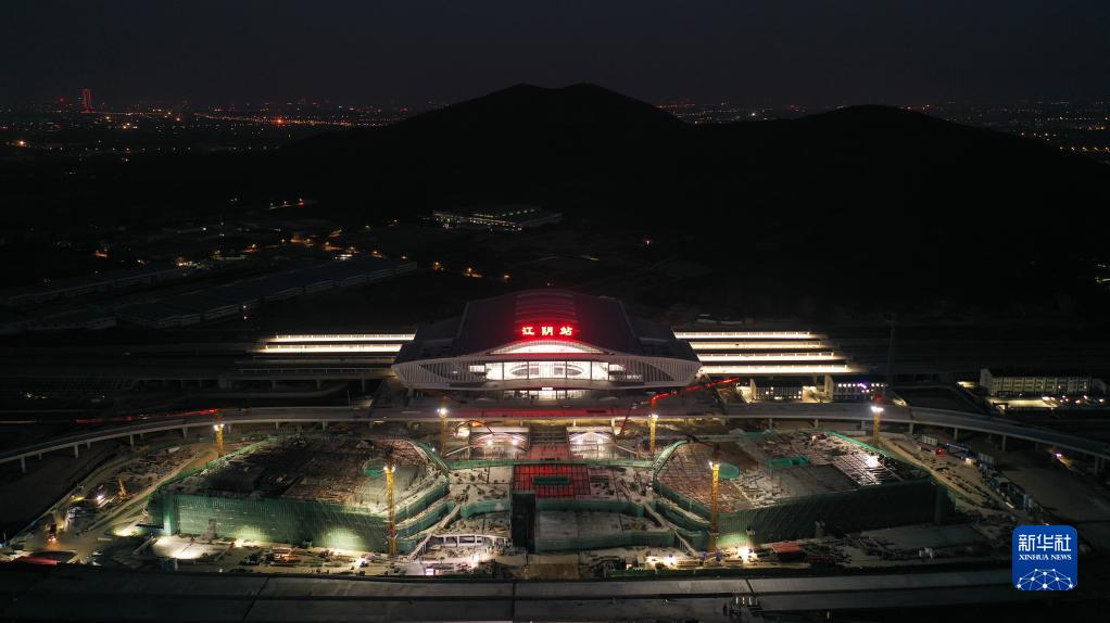 4月10日拍攝的滬寧沿江高鐵江陰站站房夜景(無(wú)人機照片)。
