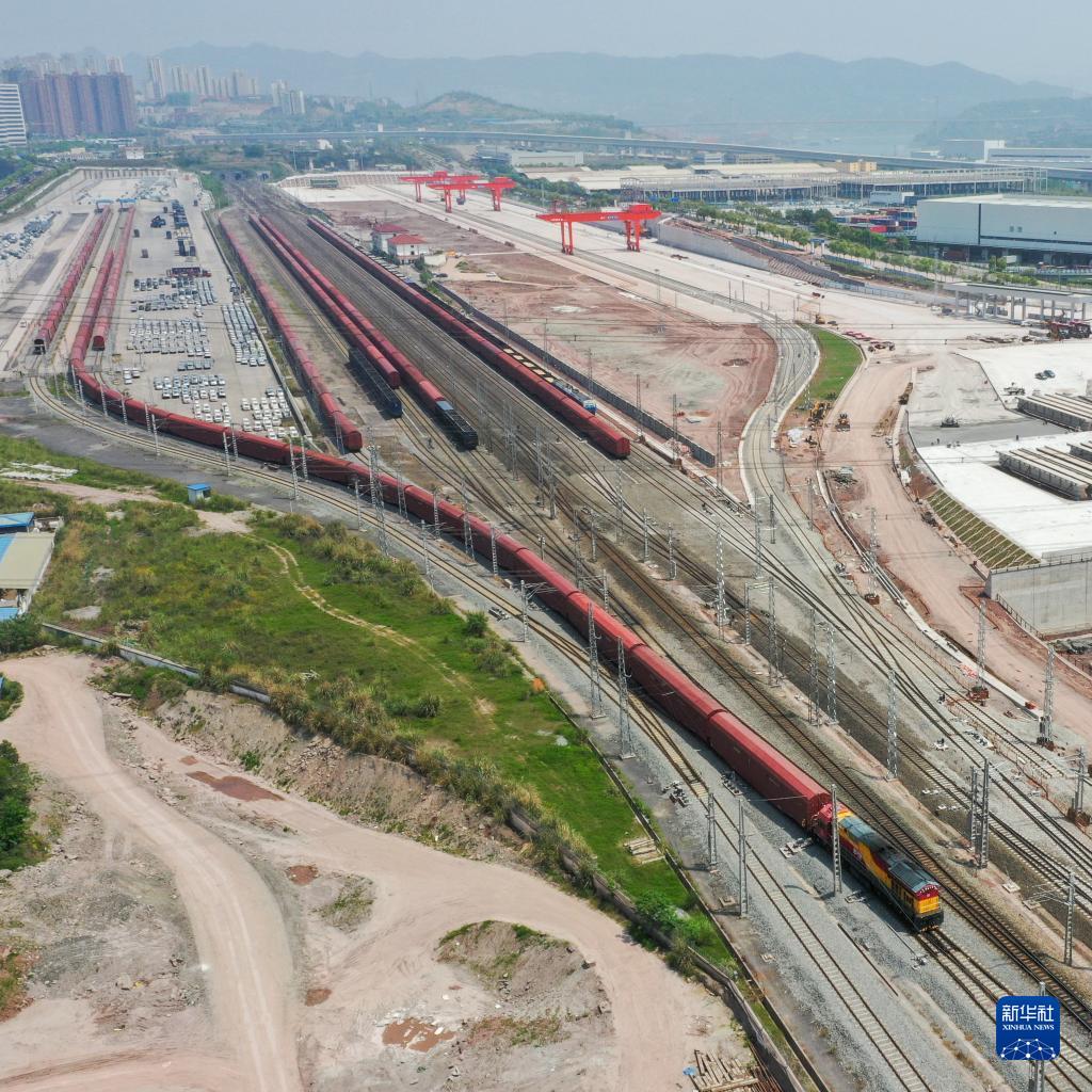 4月10日,采用JSQ型車(chē)(專(zhuān)門(mén)運輸汽車(chē)整車(chē)的鐵路貨物車(chē)輛)的中歐班列從重慶魚(yú)嘴站發(fā)車(chē)(無(wú)人機照片)。