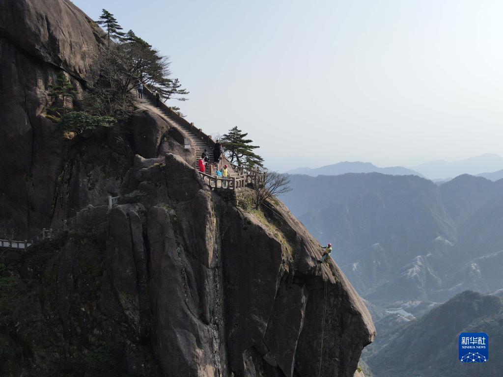 4月10日,李培生(下)和同事陳國偉(上)在黃山風(fēng)景區的懸崖峭壁上清撿垃圾(無(wú)人機照片)。