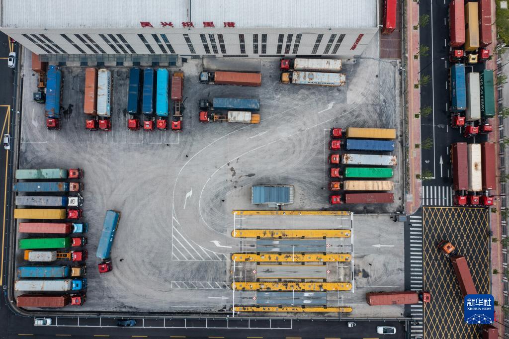 4月11日,滿(mǎn)載著(zhù)出口貨物的集裝箱車(chē)輛在吳興織里港海關(guān)監管作業(yè)場(chǎng)等候通關(guān)(無(wú)人機照片)。