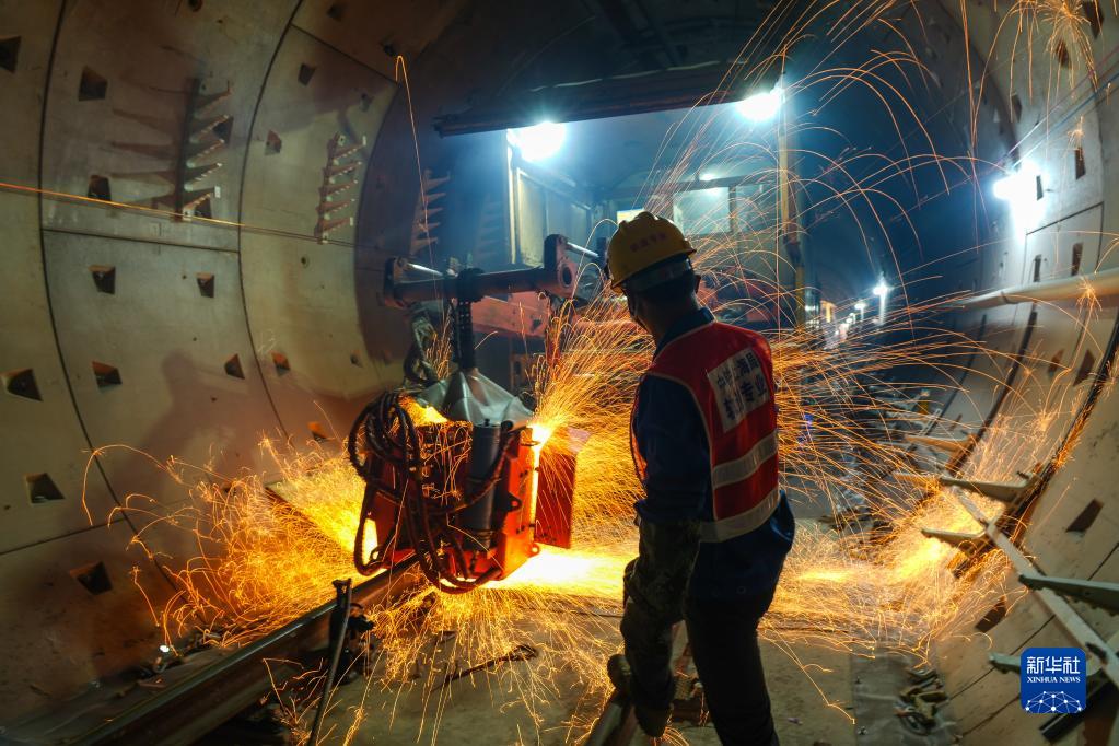 4月11日,施工人員在廣州地鐵11號線(xiàn)南石路站進(jìn)行全線(xiàn)長(cháng)軌首焊。