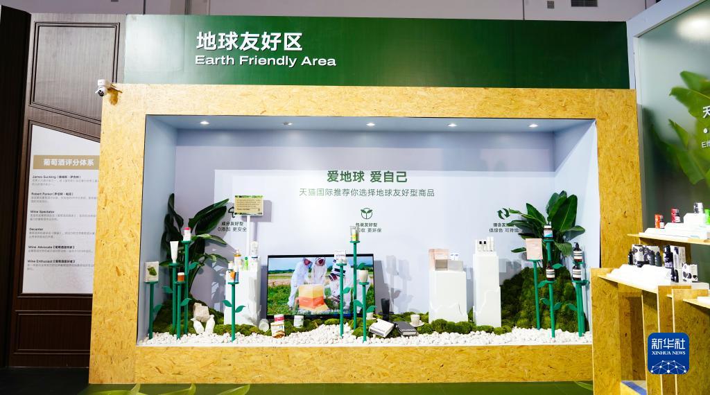 這是天貓國際展臺展示的地球友好型商品,商品包裝均為可回收材料制成(4月11日攝)。
