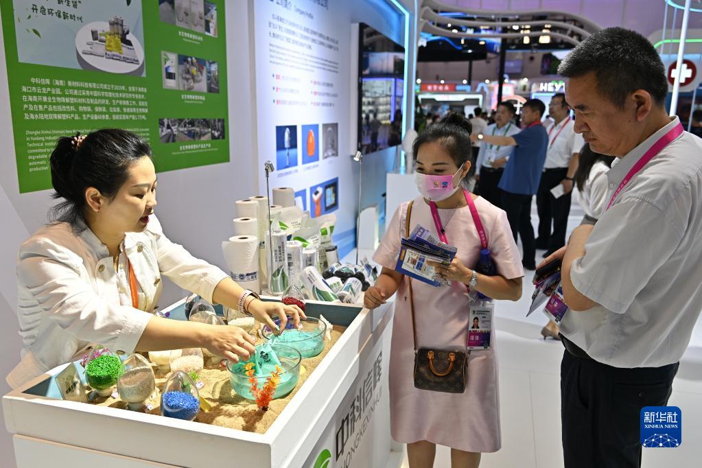 4月11日,消博會(huì )海南展臺的工作人員向媒體記者介紹快速降解材料和降解過(guò)程。