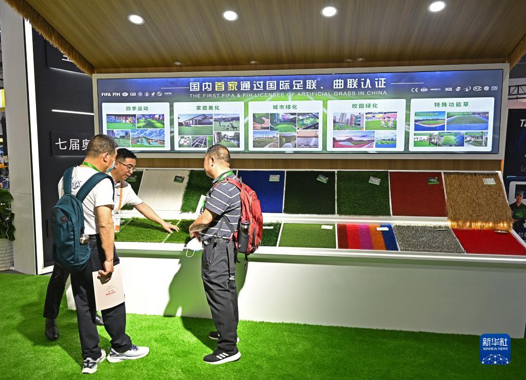 4月11日,在消博會(huì )的泰山體育展臺,工作人員向參觀(guān)者介紹可以釋放負氧離子的人造草坪。