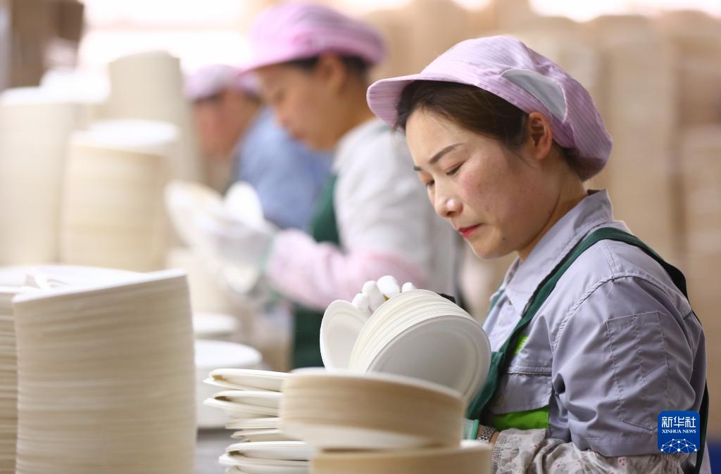 4月11日,在位于山東省滕州市西崗鎮的一家企業(yè),工人對以秸稈為原料生產(chǎn)的可降解餐盤(pán)進(jìn)行出廠(chǎng)前的質(zhì)量終檢。