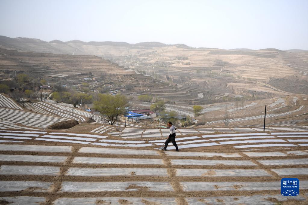 4月11日,在靜寧縣紅寺鎮胡溝村,一名村民在高標準農田里勞作。