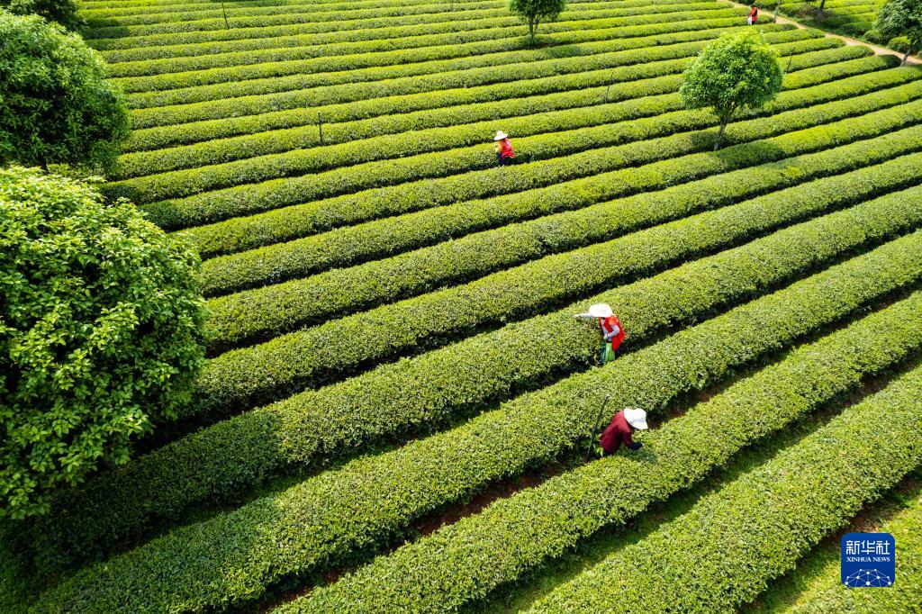 4月11日,在長(cháng)沙望城烏山貢茶基地,茶農在采摘春茶(無(wú)人機照片)。