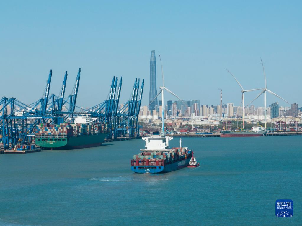 一艘貨輪在天津港航道行駛(4月7日攝,無(wú)人機照片)。