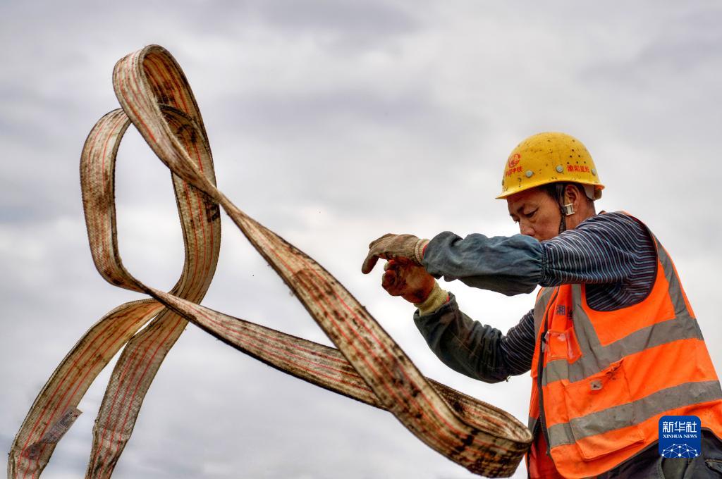 在渝湘復線(xiàn)高速南川段,工人在準備吊裝作業(yè)(2023年3月27日攝)。