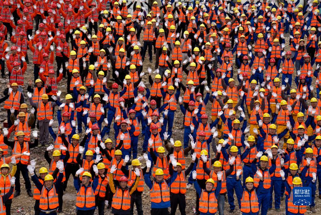參加渝湘復線(xiàn)高速的千名筑路工人在工地上合影(2023年3月31日攝)。