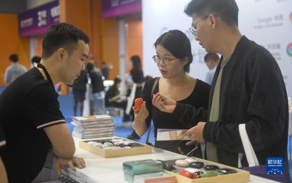 4月12日,參觀(guān)者在展會(huì )上參觀(guān)選購智能耳機。