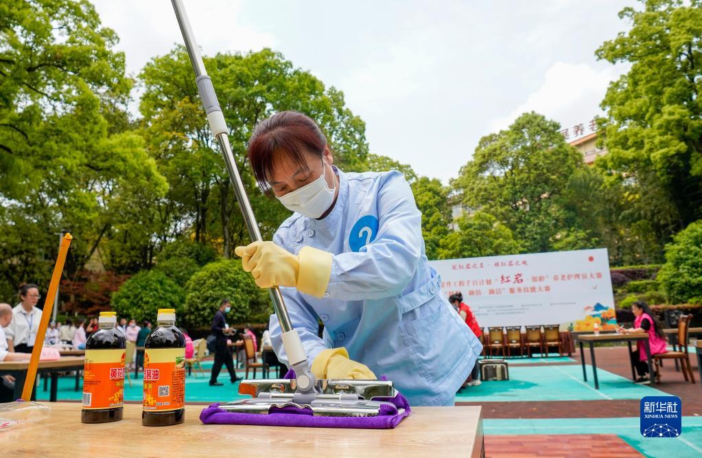 4月12日,一名參賽的養老護理員在進(jìn)行養老環(huán)境保潔項目的技能比賽。