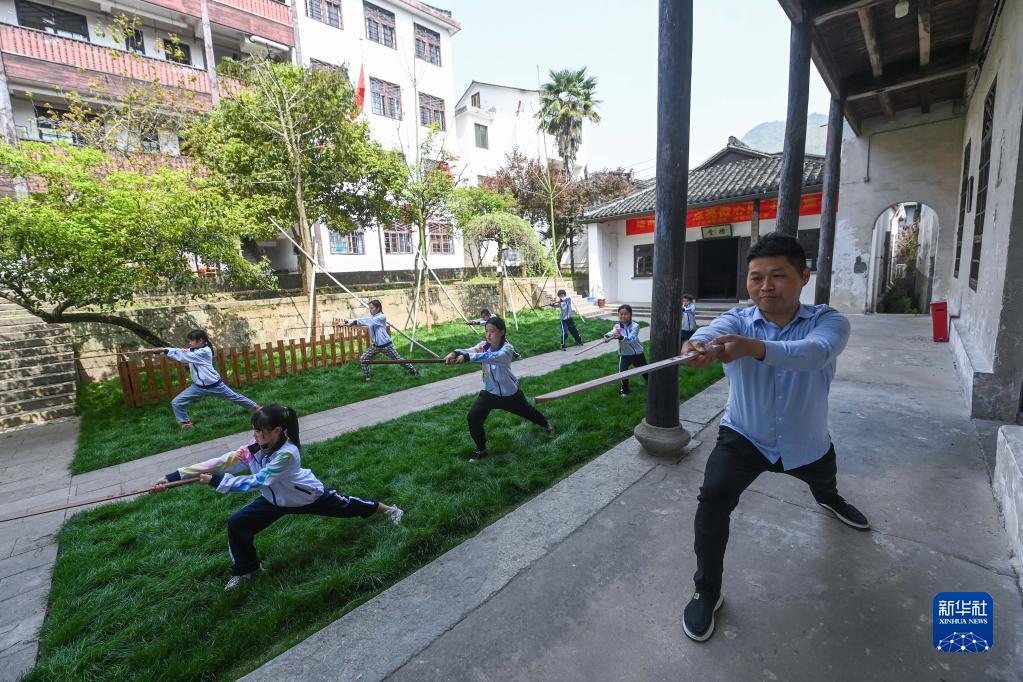 4月12日,諸暨市東白湖鎮斯民小學(xué)的學(xué)生在學(xué)習傳統武術(shù)舞劍。