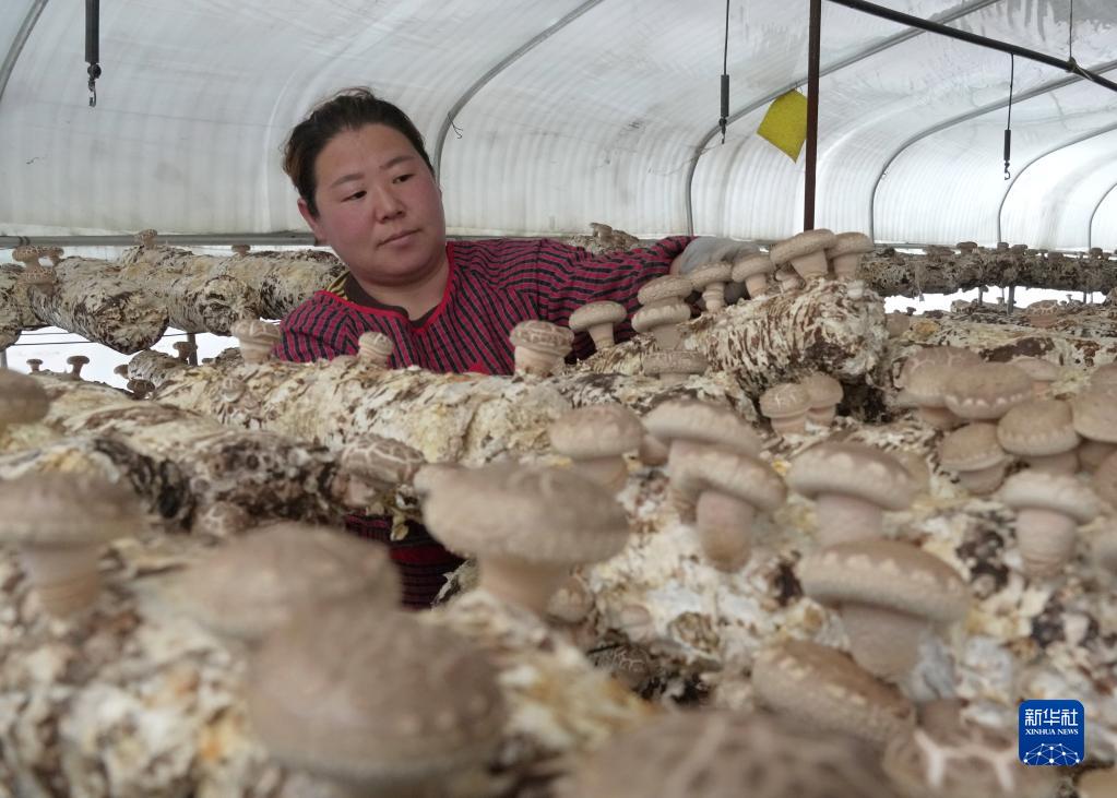 4月12日,工人在青龍滿(mǎn)族自治縣婁杖子鎮獅子坪村食用菌種植基地采摘香菇。