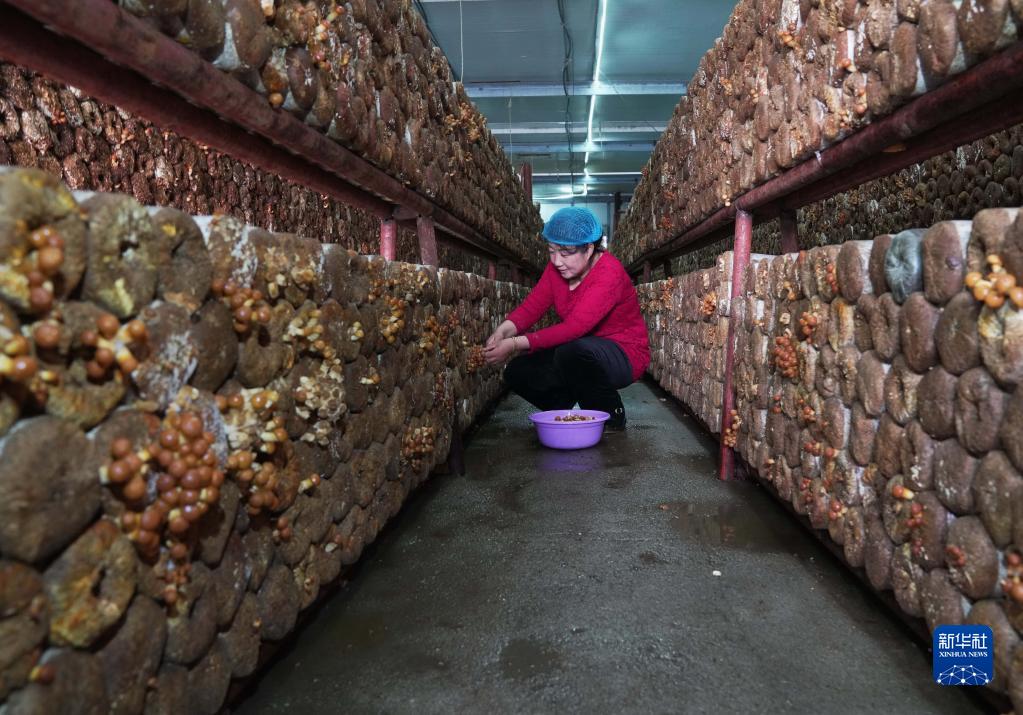 4月12日,工人在青龍滿(mǎn)族自治縣婁杖子鎮獅子坪村食用菌種植基地采摘滑子菇。
