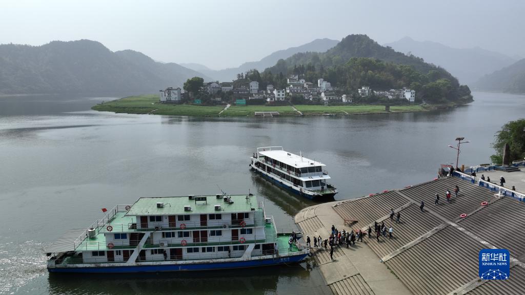 4月12日,在安徽省黃山市歙縣的新安江山水畫(huà)廊景區,游客在深渡鎮碼頭登船(無(wú)人機照片)。