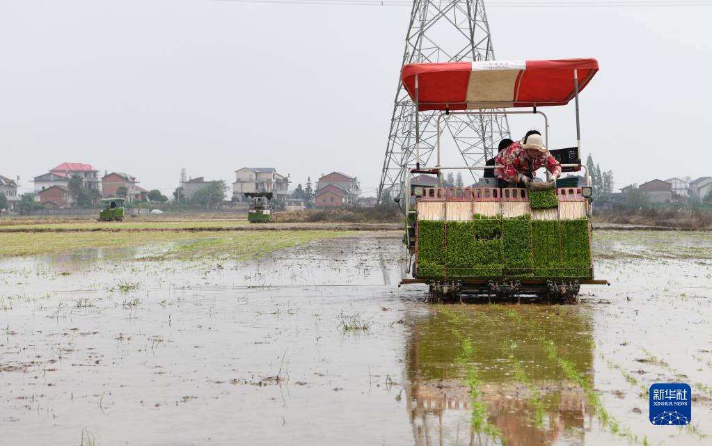 4月12日,在江西南昌縣涇口鄉后房村,當地育秧基地農事服務(wù)人員駕駛高速插秧機為種糧大戶(hù)提供機插服務(wù)。