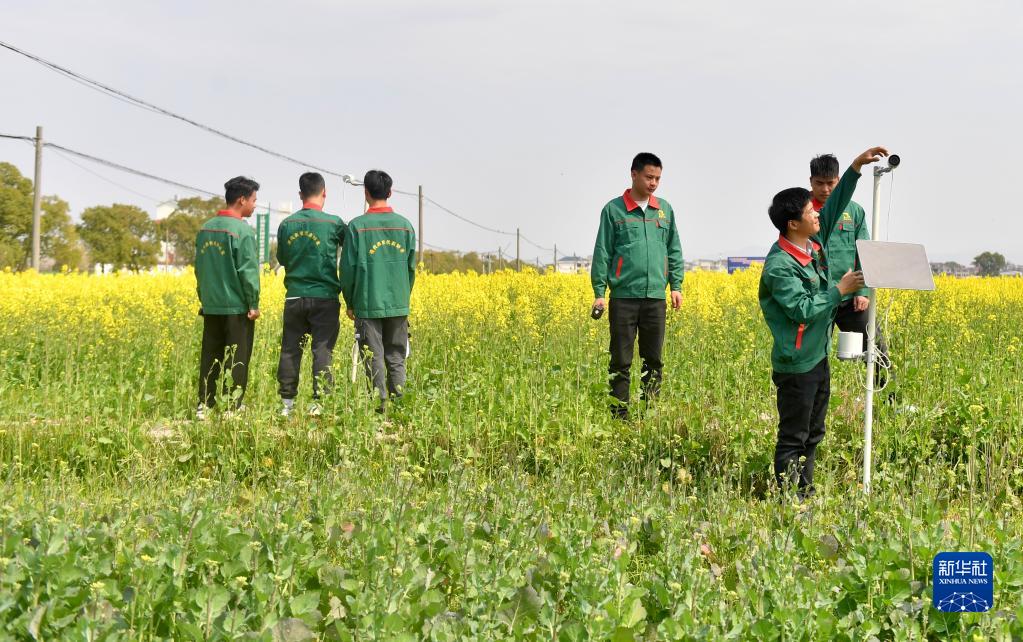 3月7日,黃從明(前)在田里和同事一起安裝農田氣象觀(guān)測儀。