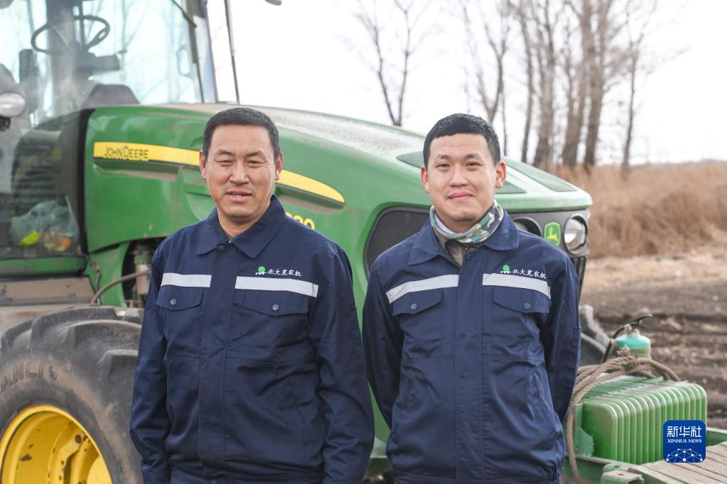 4月12日,在建設農場(chǎng)有限公司一處農田旁,許志國(左)與兒子許呈浩在大型拖拉機前合影。2019年,在外地工作的許呈浩回到建設農場(chǎng)有限公司第四管理區,協(xié)助父親許志國進(jìn)行春耕與秋收等農業(yè)生產(chǎn)作業(yè)。