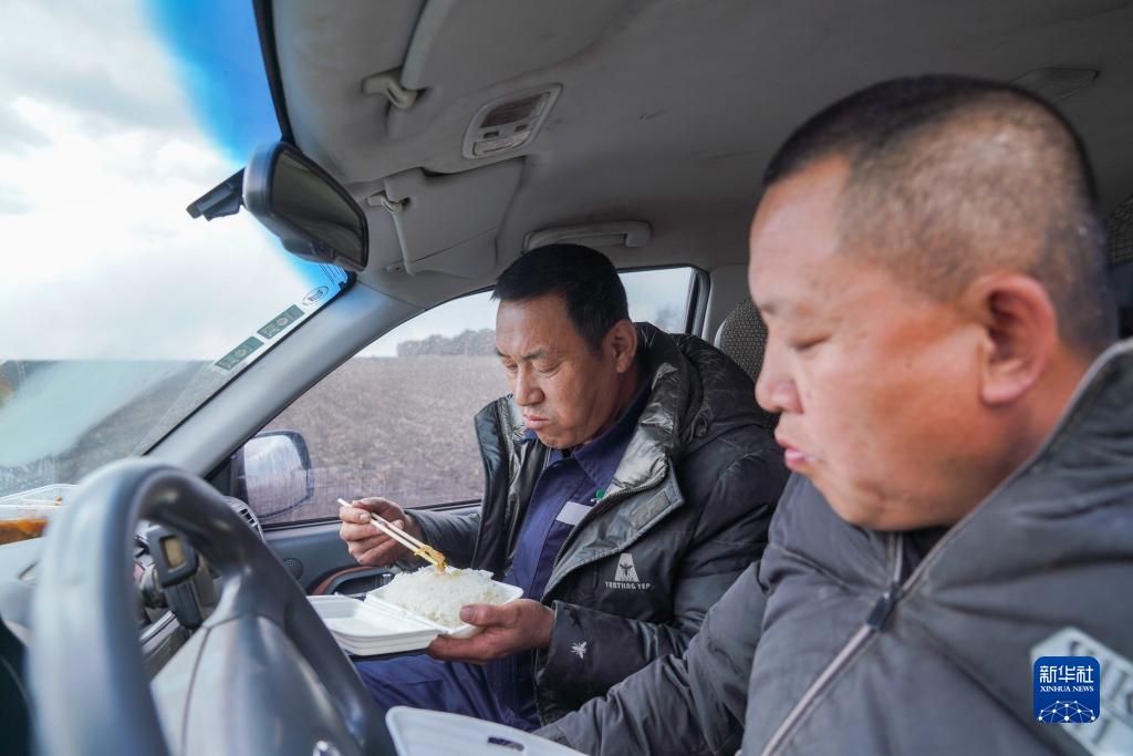 4月12日,在建設農場(chǎng)有限公司一處農田旁,許志國(左)與農機工人一起吃午飯。