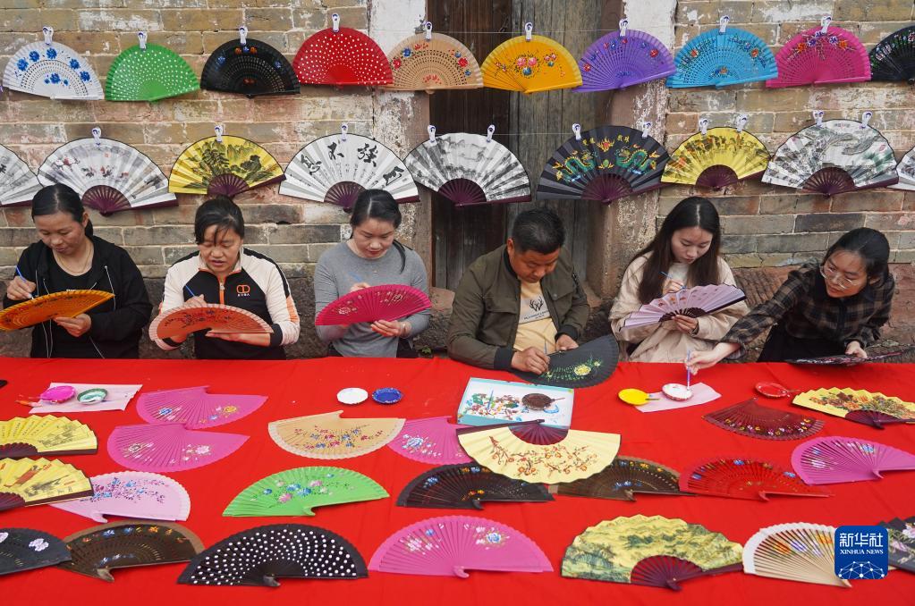 4月12日,在江西省廣昌縣甘竹鎮羅家村,村民在繪制工藝扇。