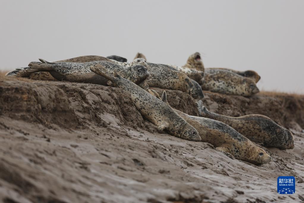 4月13日,西太平洋斑海豹在遼寧盤(pán)錦三道溝海域的灘涂上休息。
