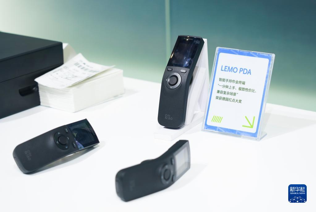 這是菜鳥(niǎo)展臺展出的國產(chǎn)智能手持作業(yè)終端,它可以助力提高物流分揀效率(4月13日攝)。