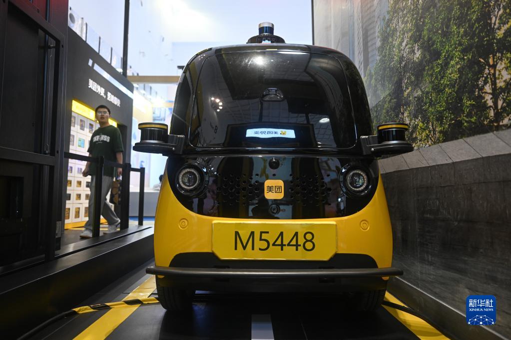這是4月13日在美團展臺拍攝的自動(dòng)配送車(chē)。
