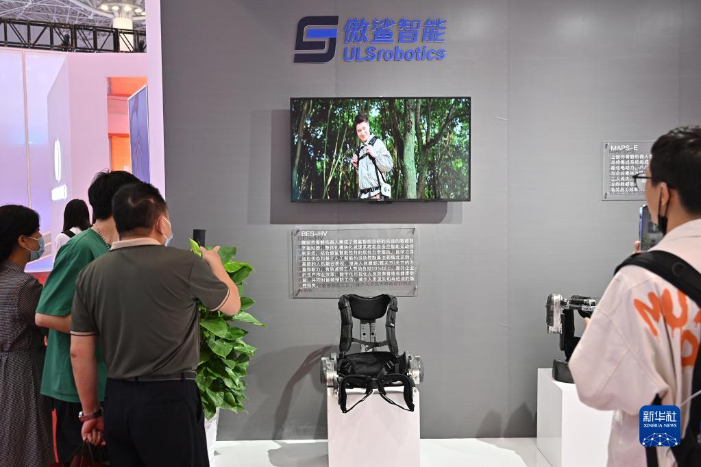 4月13日,參觀(guān)者在上海展臺了解一款腰部外骨骼機器人產(chǎn)品。