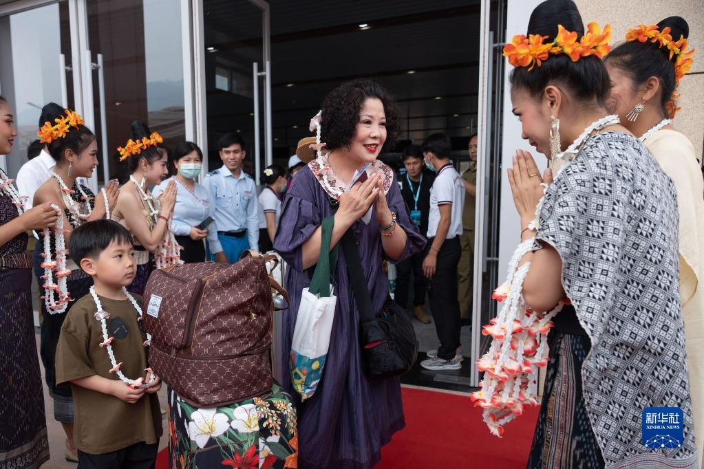 4月13日,在中老鐵路老撾磨丁站,工作人員歡迎乘坐D887次國際旅客列車(chē)的旅客抵達磨丁。