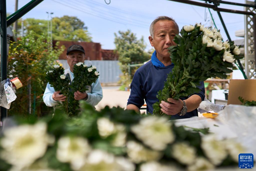 在日本埼玉縣埼玉市的園藝中心,工人開(kāi)箱檢查到貨的中國云南進(jìn)口鮮花(4月5日攝)。