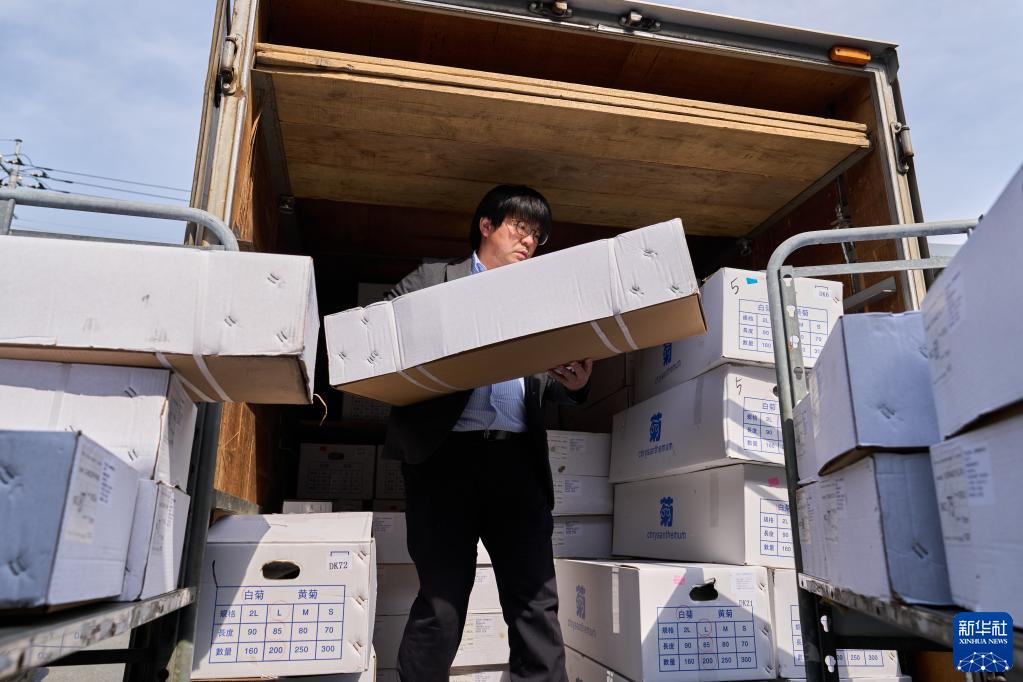 在日本埼玉縣北葛飾郡,小西武將當日到貨的中國云南進(jìn)口鮮花賣(mài)給一家鮮花加工廠(chǎng)(4月3日攝)。