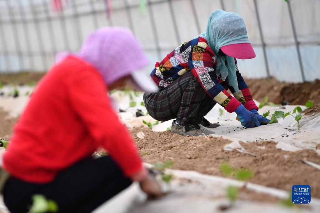 4月13日,在崇信縣錦屏鎮東莊村新豐園蔬菜生產(chǎn)基地的大棚里,農民在栽種蔬菜秧苗。