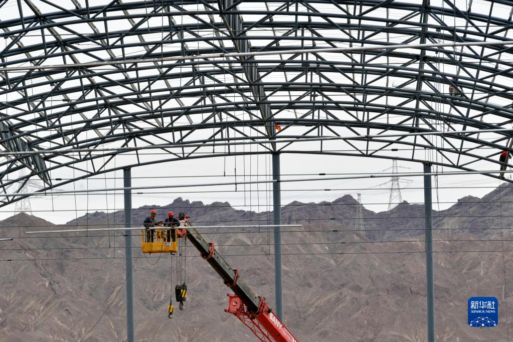 4月13日,工人在位于張掖市甘州區的20萬(wàn)噸硅系新材料綜合利用項目建設現場(chǎng)施工。