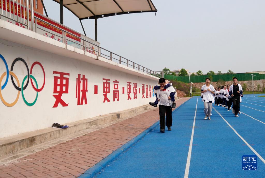 4月13日,朱金祥(左)背著(zhù)鐘華強在體育課上慢跑。