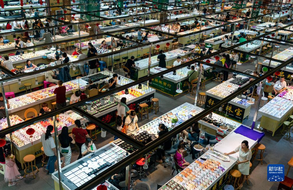 云南省德宏傣族景頗族自治州瑞麗市地處中緬邊境,是我國重要的珠寶玉石集散地之一。近日正值潑水節,到德宏州旅游的游客大幅增加,瑞麗市的珠寶玉石市場(chǎng)、直播基地一派繁忙景象,旅游熱帶動(dòng)珠寶銷(xiāo)售熱。