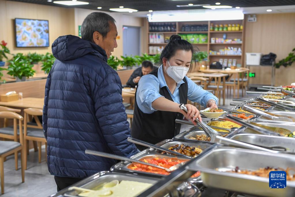 4月11日,在吉林省長(cháng)春市朝陽(yáng)區光明社區食堂,工作人員為老人盛菜。該食堂是吉林省民政廳重點(diǎn)支持的100個(gè)社區老年食堂之一。