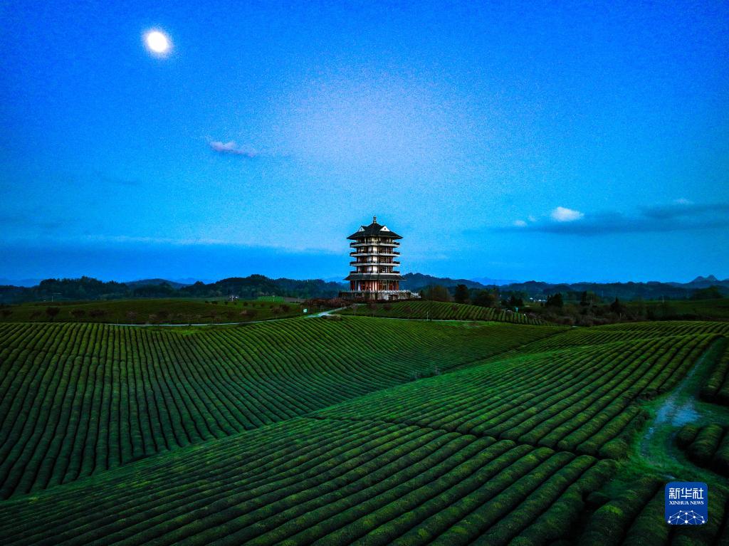 4月4日在遵義市湄潭縣永興鎮拍攝的月光下的“萬(wàn)畝茶?!保o(wú)人機照片)。